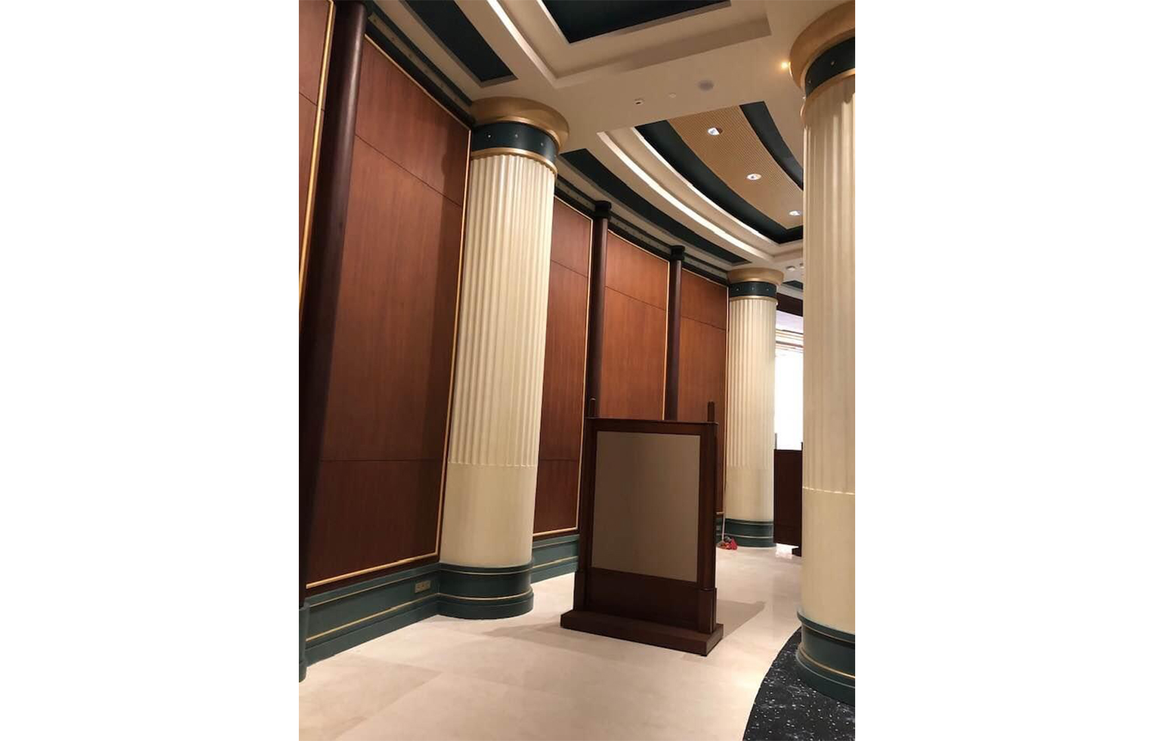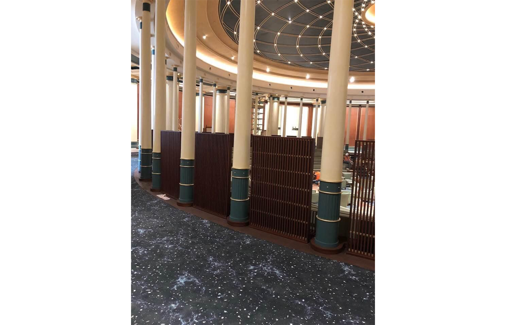 DİVAN SALONUNUN SÜTUNLAR ARKASINDA BULUNAN GEÇIŞ ALANINDAKİ KAVİSLİ DUVARLARI DEMiR KARKASLARLA İSKELET OLUŞTURULUP MEŞE KAPLAMA iLE TAMAMLANMIŞTIR. SALONDAKİ SÜTUNLARIN ARALARINA IZGARA ŞEKLİNDE 120X140 BOYUTLARINDA MEŞE SEPERATÖRLER YAPILMIŞTIR. SALONDAKİ TÜM SÜTUNLARIN ALT KISIMLARI LAKE BOYALI MDF DEN SÜTUNLARIN ÇEVRESİNİ KAPLAYACAK ŞEKİLDE ÜRETİLMİŞTİR DE ESTETİK BİR GÖRÜNÜM SAĞLAMASI AMACIYLA AYDINLATMA ELEMANLARI VE ÇİÇEKLİKLER YERLEŞTİRİLMİŞTİR